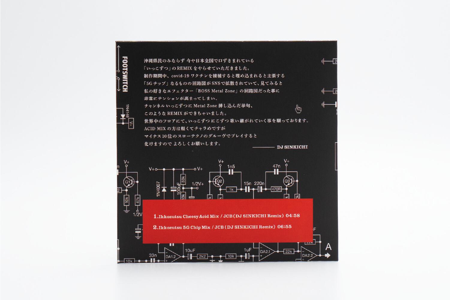 沖縄でアーティスト活動を続けるじょっちゃんバンドの曲を、 大阪アンダーグラウンドで活躍するDJ SINKICHIがリミックスした CD「イッコズツ」ジャケットと盤面のデザイン。